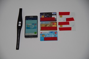 For testing you will need cards. Lot of cards - the more the better - best from different brands. Even if VISA and MasterCard share the same standard - they set even the EMV standard - there are a lot of differences which you might find out when playing around with the cards. Even VISA and VPAY or Master and Maestro have differences in the used tags. And we do not only want to read credit cards - we also want to read debit cards. My bank issues debit cards with NFC since years and I'm lucky that they have also an Android App with a 100% EMV compatible SIM based card emulation and a wearable micro card. All these EMV cards - debit and credit - are readable with an Arduino / ESP8266.