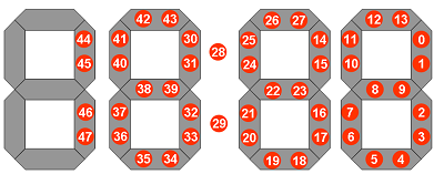 Neopixel displays can be built in individual ways. You have to define which pixel belongs to which segment. A digit consists of 7 segment and optionally one segment for the decimal point. The segments are ordered clockwise, starting at the top:
