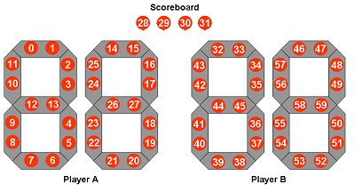 Now you can handle each display individually: either displayA.print() for playerA or displayB.print() for playerB. You can address the additional pixels (28 - 31) with the standard functions from Adafruit library (i.e. strip.setPixelColor(28, 0xFF0000)). For the scoreboard an example sketch is included with the library examples.