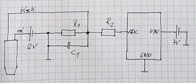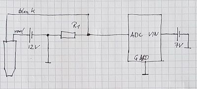 Der Sensor wird mit +12V versorgt, der zweite Anschluss geht zunächst an den Analogeingang und mit einem Messwiderstand an GND. Die Basisschaltung sieht wie folgt aus: