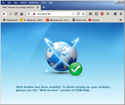 Mache einen ersten Test. Öffne ein neues Browserfenster und kontrolliere nach Eingabe der IP der NAS ob der Webserver läuft: