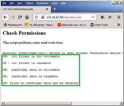 <?php echo "<h2>Check Permissions</h2>\n"; echo "<p>This script performs some read/write tests<p>"; $filepath = "data"; $filename = "temp.txt"; // current iot folder should have read only echo "<pre>\n"; // write $handle = fopen($filename,"a+"); if ($handle) echo "NOK: iot folder is writeable<br>\n"; else echo "OK: iot folder is not writeable<br>\n"; // read - obviously we an read otherwise the script would not run echo "OK : iot folder is readable<br>\n"; // delete - only in case it was writeable if ($handle) { fclose ($handle); if (unlink($filename)) echo "NOK: files in iot folder are deleteable<br>\n"; else echo "NOK: files in iot protected from delete, but still - we don't want files to be written in iot<br>\n"; } // folder with granted permissions // write $handle = fopen($filepath."/".$filename,"a+"); if ($handle) { echo "OK: subfolder $filepath is writeable<br>\n"; fclose ($handle); } else echo "NOK: subfolder $filepath is not writeable<br>\n"; // read $handle = fopen($filepath."/".$filename,"r"); if ($handle){ echo "OK: subfolder $filepath is readable<br>\n"; } else echo "NOK: subfolder $filepath is not readable<br>\n"; // delete if ($handle){ fclose ($handle); if (unlink($filepath."/".$filename)) echo "OK: files in subfolder $filepath can be deleted<br>\n"; else echo "NOK: files subfolder $filepath can not be delete<br>\n"; } echo "</pre>\n"; ?>