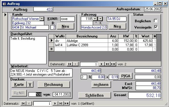 Direkt aus der Auftragserfassung können neue Kunden mittels Listbox gesucht oder angelegt werden ohne einen Menübaum mühevoll durchsuchen zu müssen. Gleiches gilt für die Fahrzeuge des Kunden. Aufgewendete Waren und die Arbeitszeit werden dem Auftrag zugeordnet, können aus der Warendatenbank ausgewählt werden. Besonders für kleine Handelsunternehmen interessant: Waren können auch freitextlich erfasst werden. Alle Dokumente (Arbeitsauftrag, Rechnung, Mahnung) können über dieses Maske ausgedruckt werden.