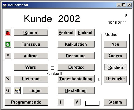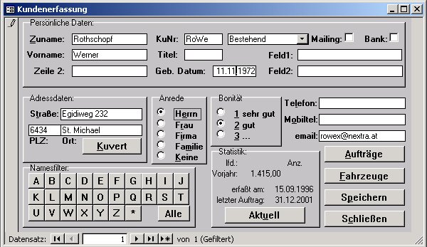 Da ohne Kunde kein Geschäft abgewickelt werden kann, ist die Kundenmaske ein zentrales Element in der Anwendung. Ausgehend vom Kunden können Fahrzeuge, Aufträge, Rechnungen erfasst und gesucht werden.