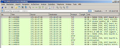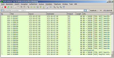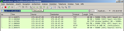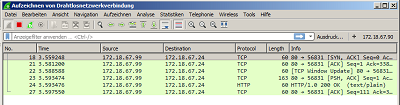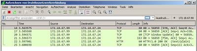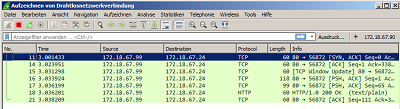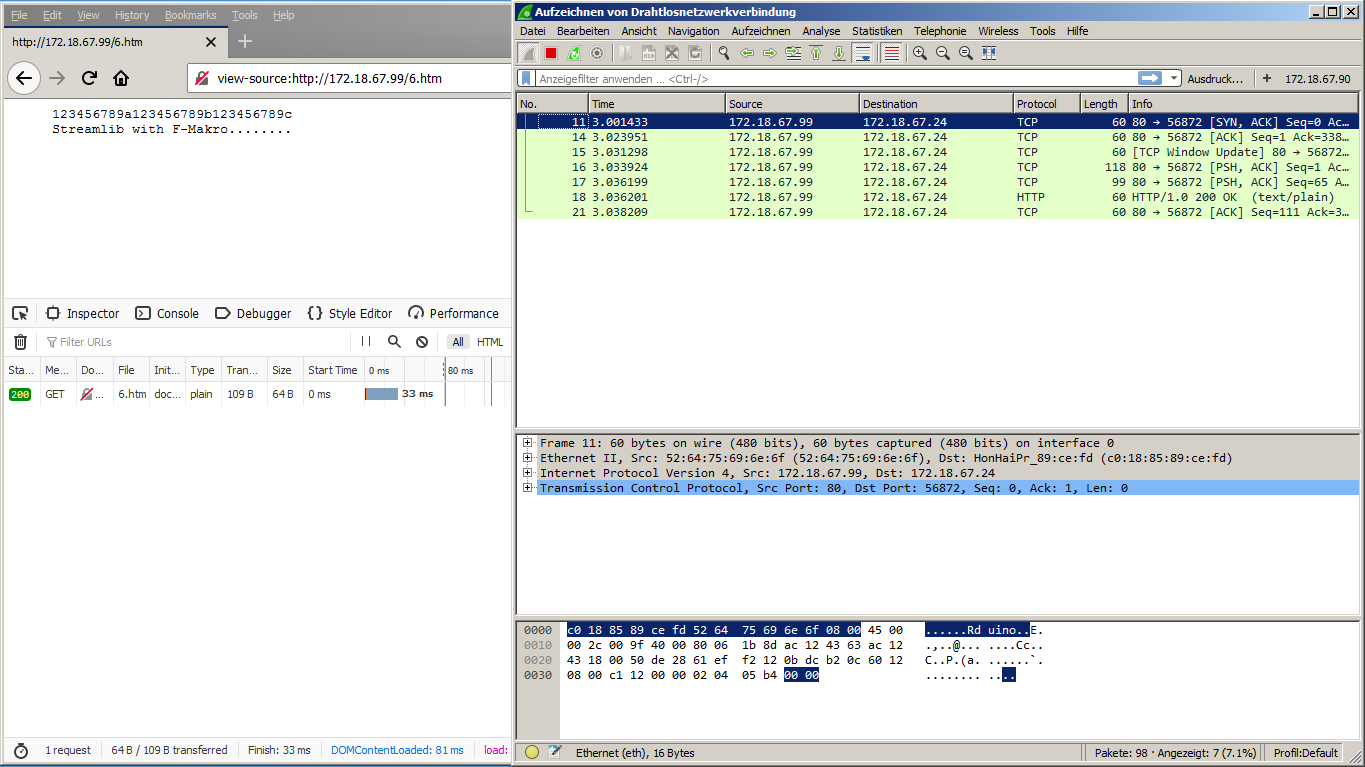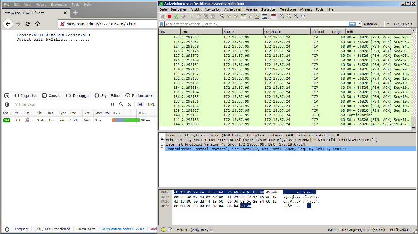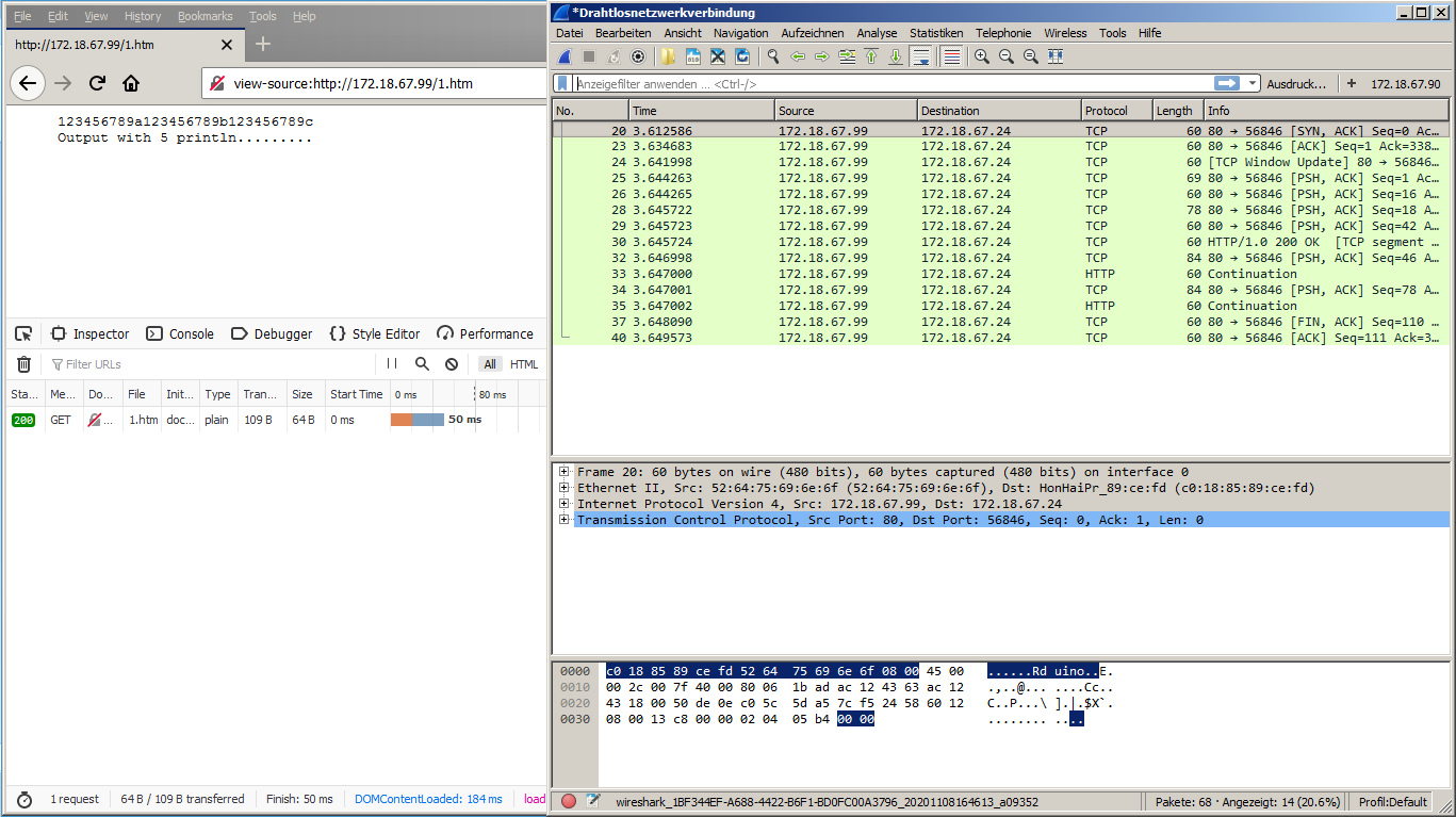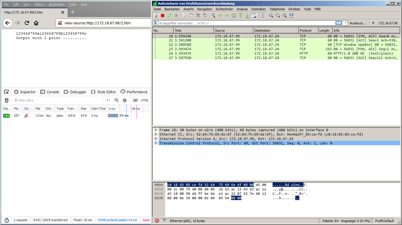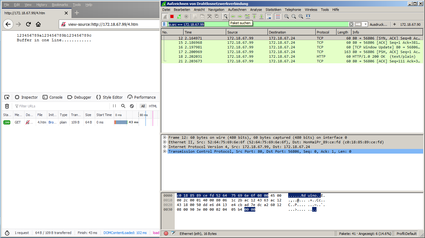 If you enlarge the picture you will see, that I only display the sourcecode to avoid that the browser requests a favicon.ico. In Wireshark you see only the packets transmitted from the Arduino Webserver to the browser for the transmitted text.