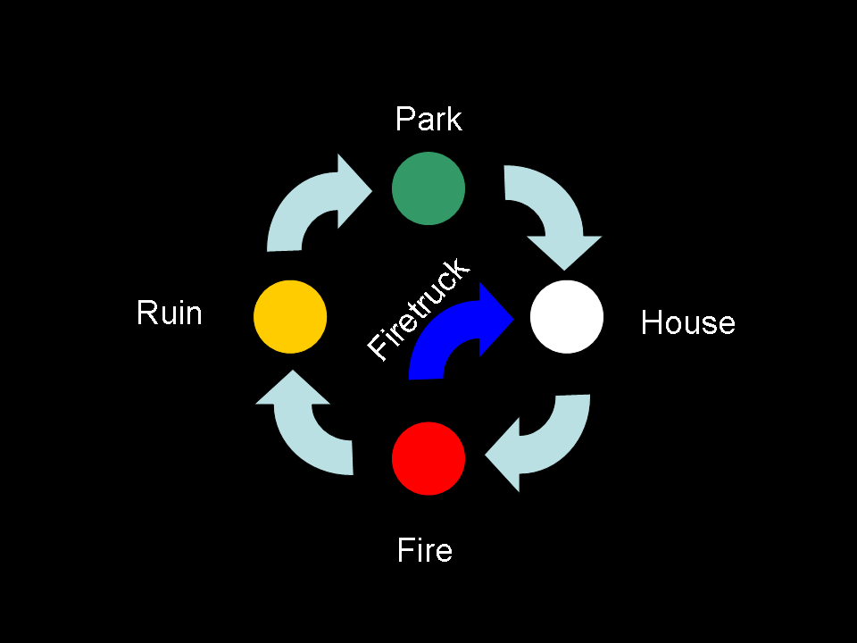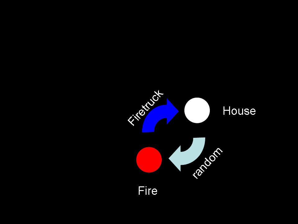 The houses are no objects because it would cost to much memory. Every house has a house number (the pixel to be lit as house) and an "address" - a street next to it so that the fire truck can come to an address (=street) and extinguish the fire: