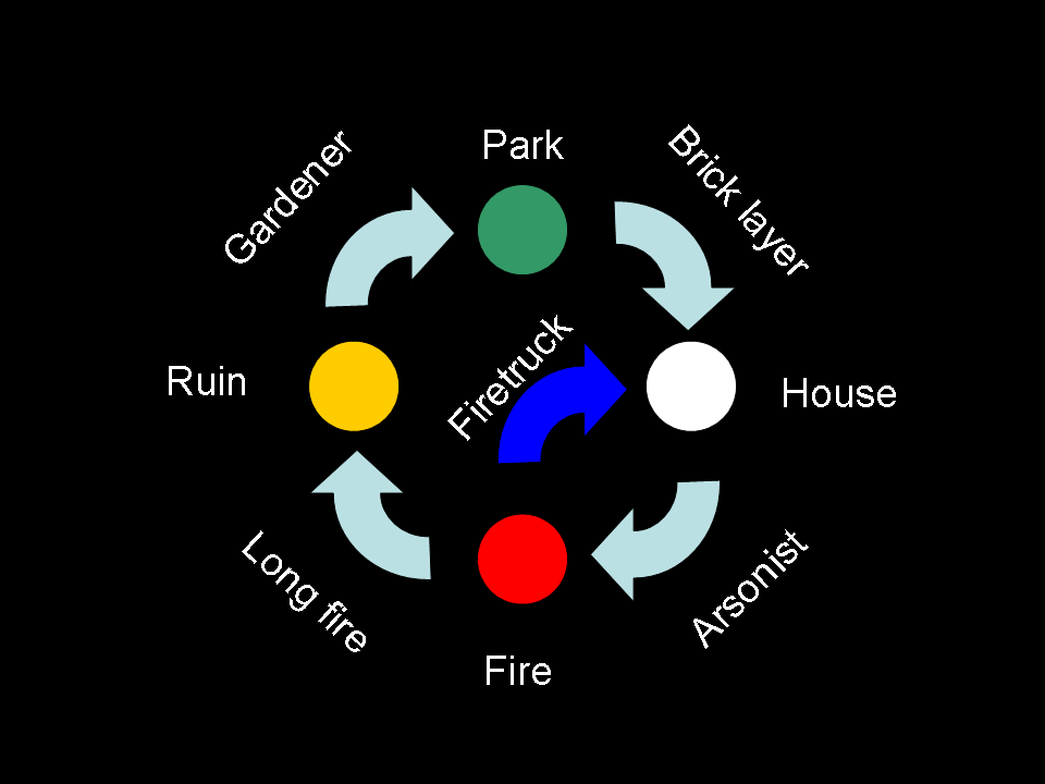 If a fire can not extinguish in time, the house will burn down and become a ruin (yellow). Over time, ruins become beautifully landscaped parks again. One day a park will be used to build new houses. So I came to following lifecycle for the houses