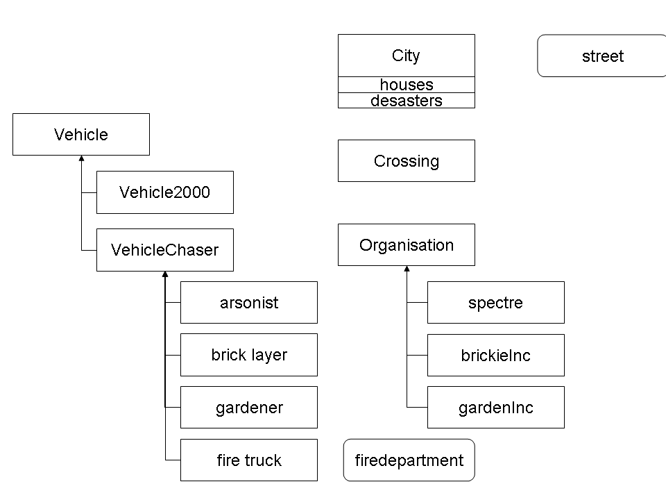Vechicles where already explaind. They can have different driving characterics. The fire trucks are pretty strict about their destination, if their path is blocked, they stop and continue if the way is free again. The gardener is heading to a ruin and will need some time to recreate the ruin to a park. The brick layer acts very similar and converts parks to houses. The arsonist heads to any house and start a fire at this house. The other cars keep moving and try a different route. Each vehicle can have it's own color on creation and can have it's own speed. The cars of the gardener, construction team and arsonist are chasing vehicles. This means they can find a target street. These vehicles get their order (where to go) from their Oranization.