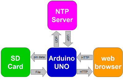 The basic idea is to display on the Arduino UNO web interface some data and log data on the SD Card. As we would need a time stamp for the log file, we will let the Arduino retrieve the current time from a NTP server with SNTP. As we have already a web interface it would be nice if we could download the collected data from the Arduino with the web browser.