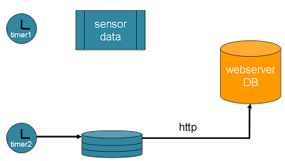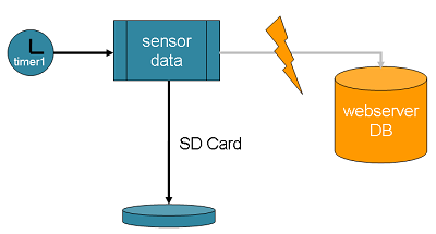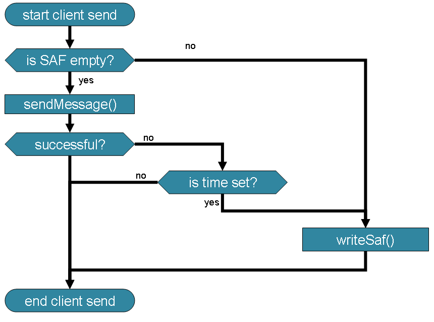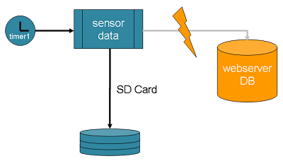 I wanted to have all data in the database in the correct order. Therefore the client timer checks if any SAF files are currently stored on the SD Card before the timer fires the new transmission to the server. If SAF files are available the current data will be appended as new SAF file to the SD Card. The transmission to the webserver is (implicit) handled by the SAF task. Therefore newer data can't be sent as long as older data is stored on the SD card. See following program flow: