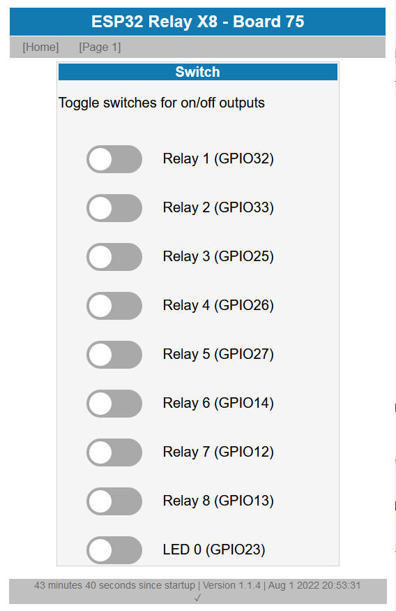 Page 1.htm is just for debugging. It shows the states of all pins and offers simple toggle buttons to switch the relays.