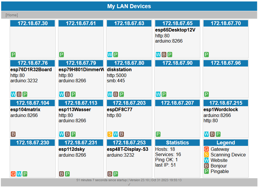 Each box represents one device. The IP is in the blue caption. If the device provides a hostname it will be shown in bold. Each registered service will be shown with the port. If the device has a webserver the full box is a link to that device:
