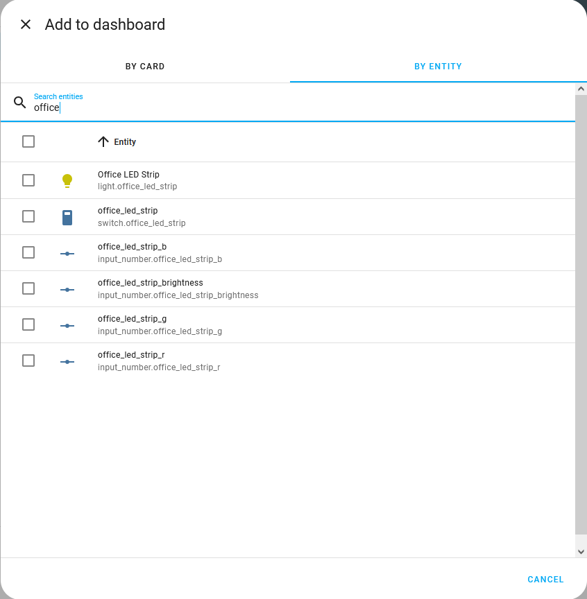 Now you can add a new card by entity. Chose your entity (use the light - not the switch!) and press CONTINUE