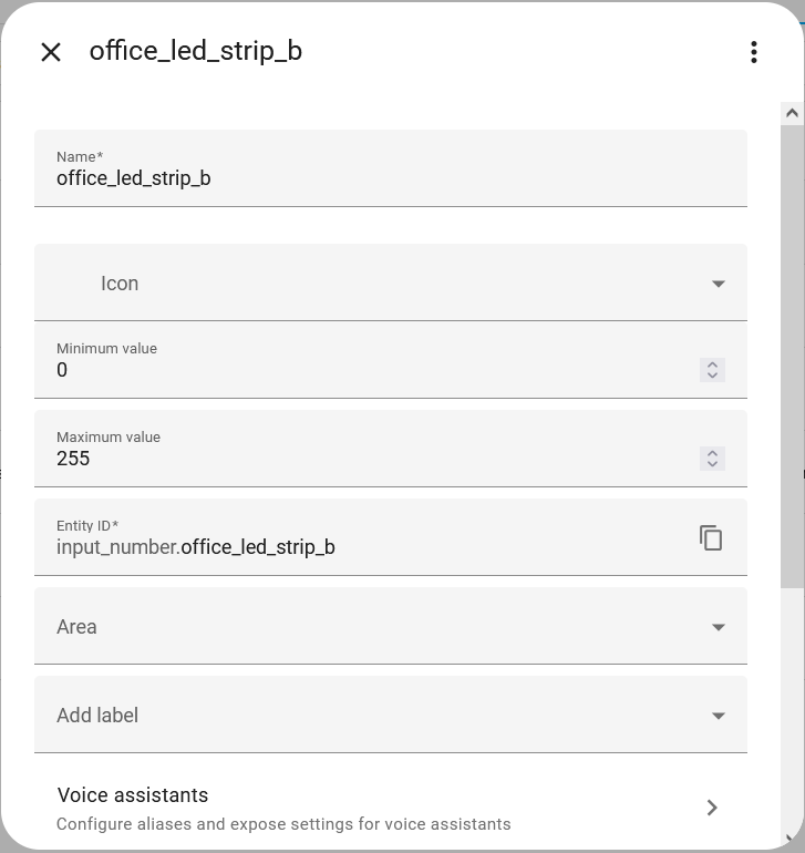 #mylight.yaml # see also https://www.home-assistant.io/integrations/light.template/ - platform: template lights: office_led_strip: friendly_name: "Office LED Strip" #Defines a template to get the state of the light value_template: "{{ states('switch.office_led_strip') == 'on' }}" #Defines a template to get the RGB color of the light. Must render a tuple or a list (red, green, blue). rgb_template: "({{ states('input_number.office_led_strip_r') | int}}, {{ states('input_number.office_led_strip_g') | int}}, {{ states('input_number.office_led_strip_b') | int}} )" turn_off: service: switch.turn_off target: entity_id: switch.office_led_strip turn_on: service: switch.turn_on target: entity_id: switch.office_led_strip set_level: - service: input_number.set_value data: value: "{{ brightness }}" entity_id: input_number.office_led_strip_brightness - service: switch.turn_on data_template: entity_id: switch.office_led_strip set_rgb: - service: input_number.set_value data: value: "{{ r }}" entity_id: input_number.office_led_strip_r - service: input_number.set_value data: value: "{{ g }}" entity_id: input_number.office_led_strip_g - service: input_number.set_value data: value: "{{ b }}" entity_id: input_number.office_led_strip_b - service: switch.turn_on data_template: entity_id: - switch.office_led_strip
