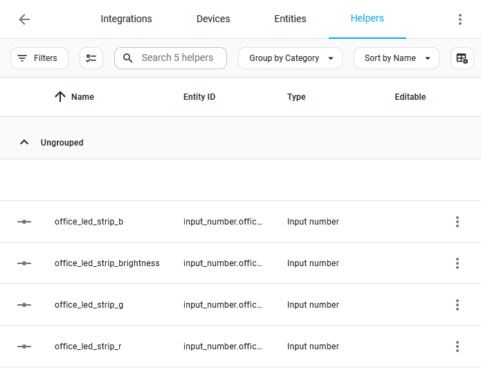In HA go to Settings / Devices & services and chose Helpers. You will need 4 Helpers to store the value for red, green, blue and brightness.
